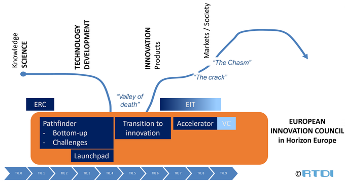Enfoque EIC desde visiones tecnológicas visionarias (programa Pathfinder hasta TRL4), hasta emprendimiento disruptivo (EIC Accelerator hasta TRL9) a través del nuevo instrumento Transition to Innovation (para proyectos prefinanciados desde TRL4 hasta 6)»