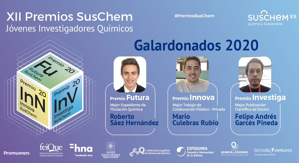 El día 15 de Julio de 2020 la Plataforma Tecnológica de Innovación de Química Sostenible SusChem España, falló la duodécima edición de sus premios SusChem Jóvenes Investigadores Químicos, cuyo objetivo es reconocer, apoyar, promocionar y promover la actividad científico-divulgativa entre los jóvenes investigadores químicos españoles.